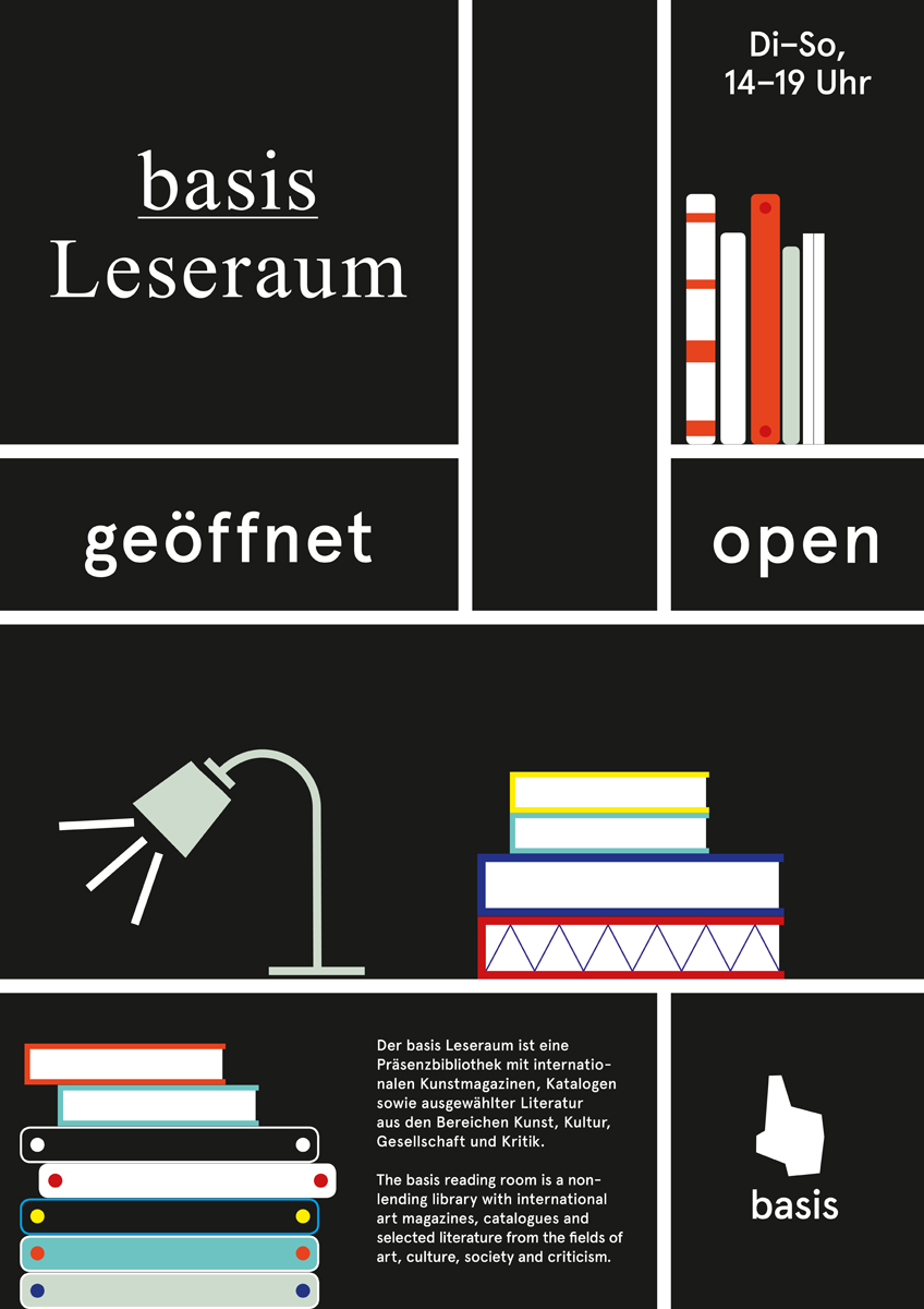Im Leseraum stellt basis eine breite Auswahl an internationalen Kunstmagazinen, Katalogen sowie ausgewählter Literatur aus den Bereichen Kunst, Kultur, Gesellschaft und Kritik als Präsenzbibliothek öffentlich zur Verfügung. Zusätzlich werden Verlage oder Konzeptbuch-handlungen eingeladen, den Leseraum inhaltlich mit thematisch erweiternder Literatur zu ergänzen.